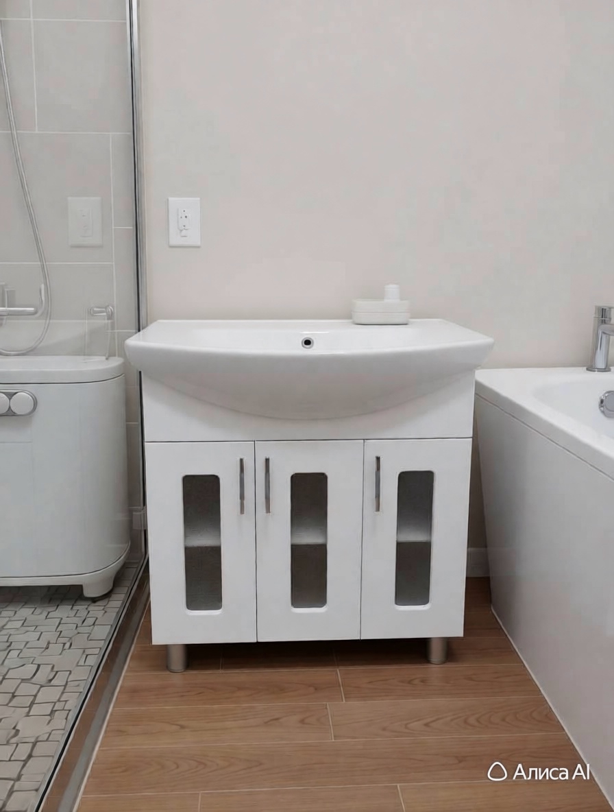 Тумба для ванной "Идеал 80" под умывальник "Балтика-80" это гармонично созданная композиция из стекла и МДФ                                                                            Размеры в сборе - Ш 65 x В 83 x Г 45 см.                                                                      Три вместительные полки тумбы из влагостойкого МДФ создадут порядок в вашей ванной комнате, сохраняя красоту и функциональность долгие годы. Эргономичный дизайн тумбы идеально дополнит пространство санузла, добавив нотки элегантности и уюта. С тумбой "Идеал" ваша ванная станет еще комфортнее и стильнее!