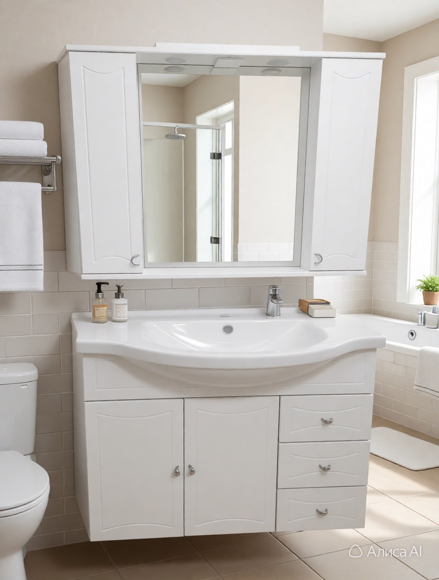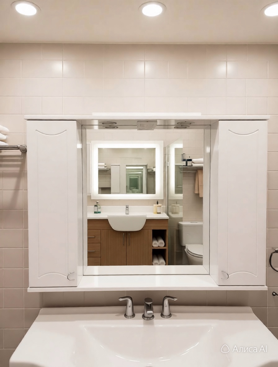 Встроенная подсветка зеркала обеспечит комфорт при использовании, а просторные внутренние полки позволят удобно разместить всю необходимую косметику и средства гигиены.